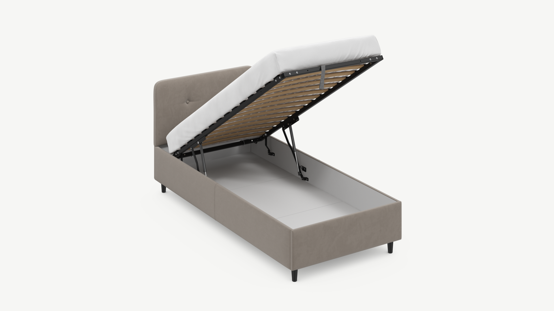 • Скрытая под основанием вместительная емкость без внутренних перегородок позволяет использовать всю площадь подкроватного пространства для хранения вещей.
