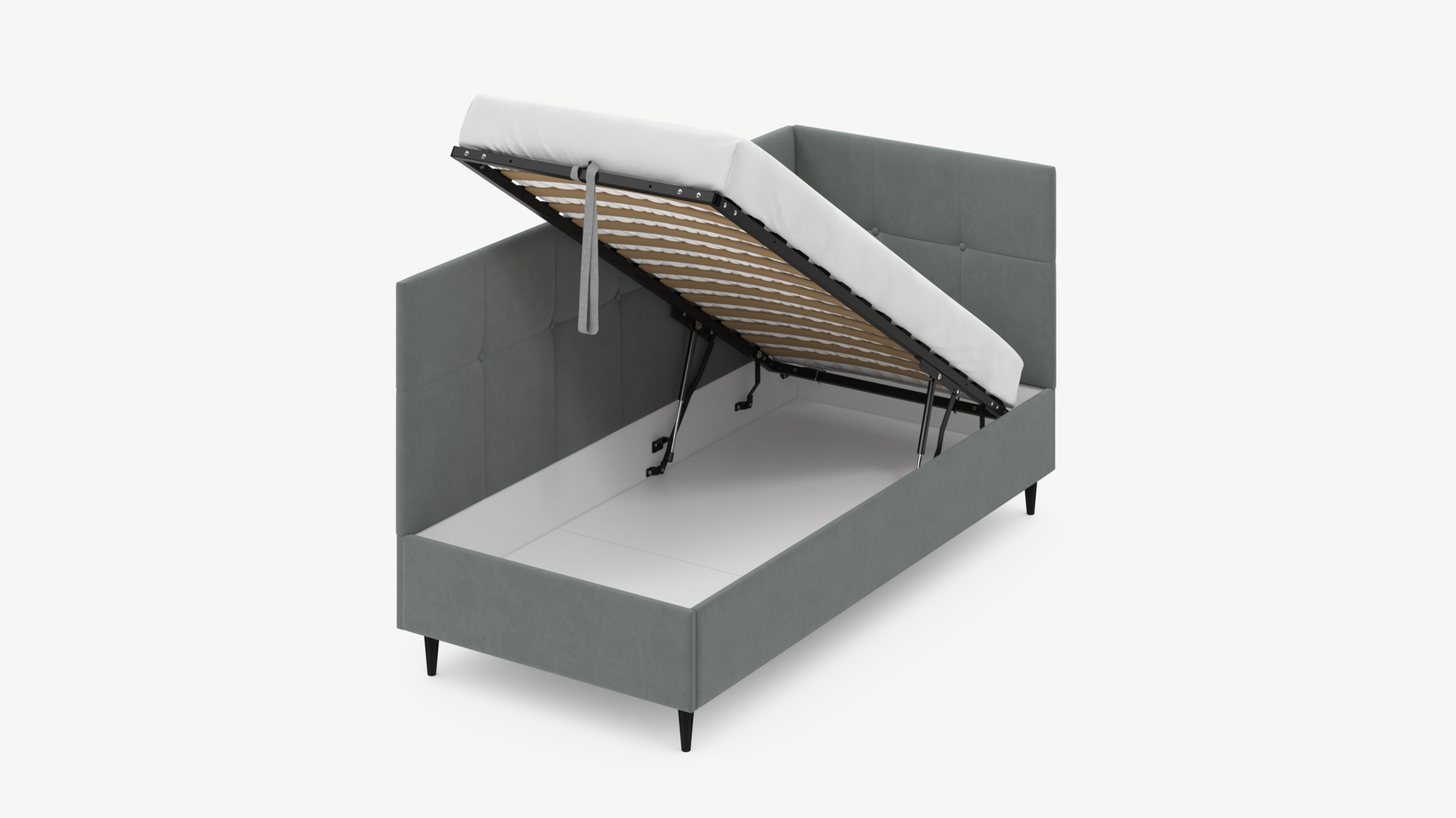 • Регулируемый подъемный механизм имеет два положения установки газовых амортизаторов в зависимости от веса матраса. Это дает возможность оптимально подстраивать угол подъема основания, а также плавно и бесшумно поднимать и опускать спальное место.