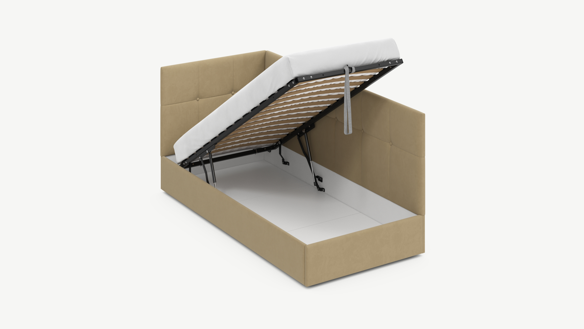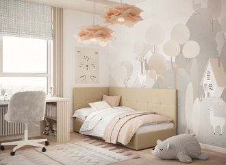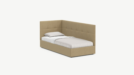 Угловая односпальная кровать MOON FAMILY 1261 с мягкой спинкой и изголовьем создаст в Вашей спальне ощущение уюта. Крупная квадратная стежка привносит в интерьер графических акцентов, а вставка из пуговиц наполняет пространство ощущением домашнего тепла.